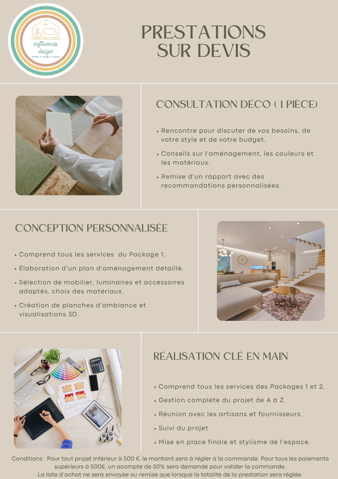 Chaque mission débute par un premier échange pour comprendre vos envies. Je vous remets ensuite un devis personnalisé, détaillé et sans surprise.